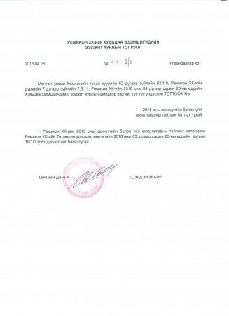РЕМИКОН ХУВЬЦААТ КОМПАНИЙН ХУВЬЦАА ЭЗЭМШИГЧДИЙН АНХААРАЛД Хувьцаа эзэмшигчдийн ээлжит хурал 2015 оны 04 сарын 30-ний өдрийн Пүрэв гаригт 11.00 цагт "Хера Индастриал парк”-ийн (Монгол Улс, Улаанбаатар хот, Сонгино хайрхан дүүрэг,